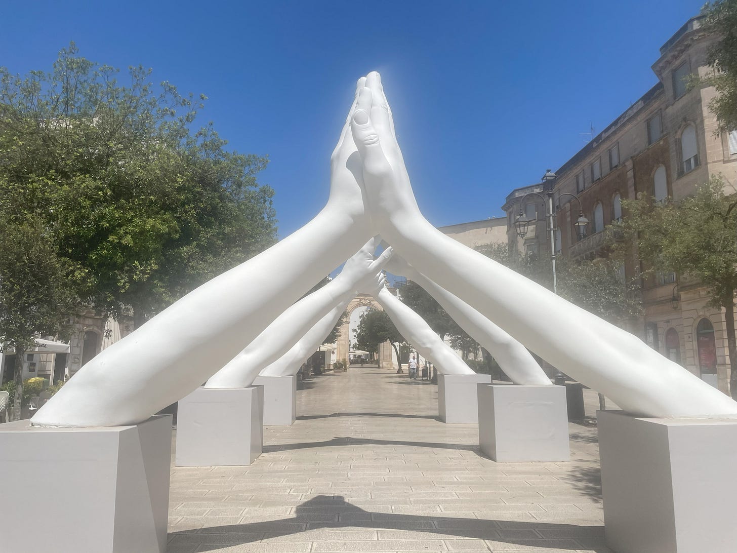 You can’t walk past this sculpture in Martina Franca, in Piazza XX Settembre, Puglia, without thinking about the possibilities of peace and dropping our partisan battles for friendship. Walking through the green square to the park, you can’t miss it. You feel the potential of unity, getting the world together.